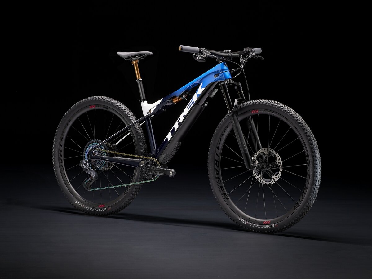 A lightweight, full OCLV Mountain Carbon frame with 60mm of travel, a 120mm RockShox SID Ultimate fork with Charger Race Day damper, remote lockout, and Trek's exclusive lightweight IsoStrut FOX Factory shock. A Fazua Ride Trail 50 motor and 250Wh battery that can assist up to 20 mph when it's on, and gives zero drag when it's off, plus a handlebar-mounted Fazua Ride Remote FX controller. A SRAM XX1 Eagle AXS wireless electronic drivetrain, a FOX Transfer SL dropper, and Kovee XXX 30 carbon wheels.